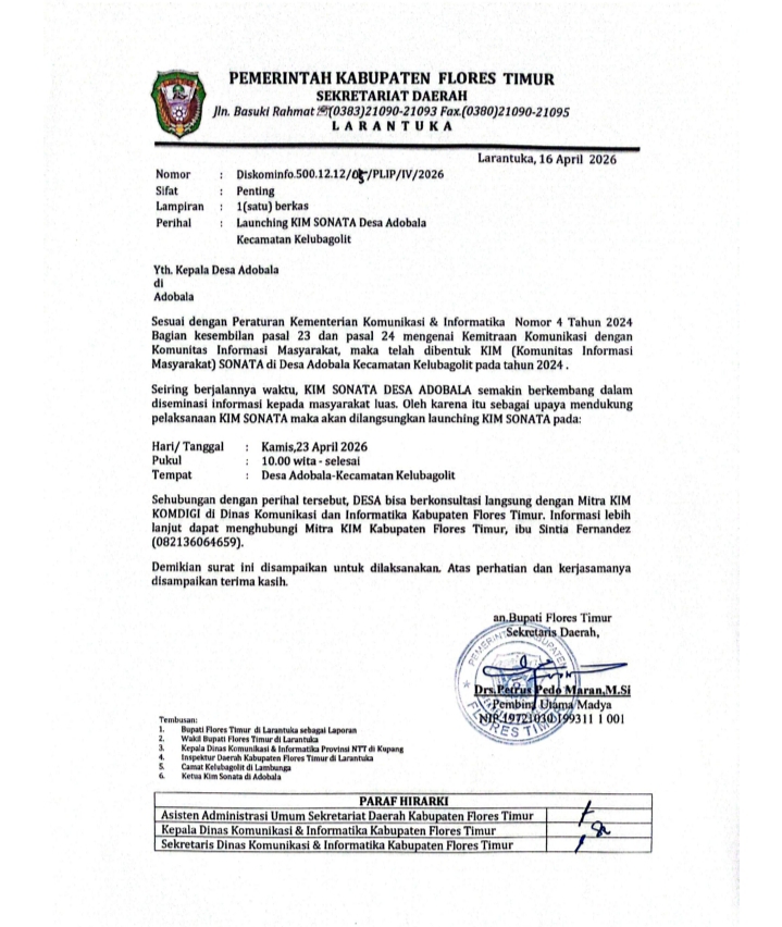 Surat dengan kop surat Sekretariat Daerah Flores Timur Nomor: Diskominfo. 500.12.12/05/PLIP/IV/2026 perihal Launching KIM Sonata Desa Adobala Kecamatan Kelubagolit tertanggal 16 April 2026. Surat ditandatangani Sekda Flores Timur, Petrus Pedo Maran.